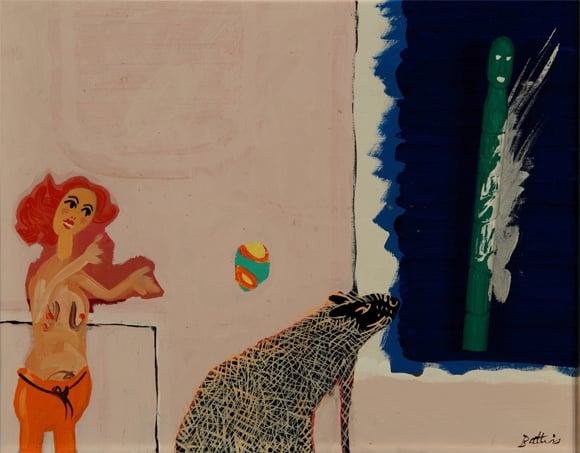 Aristophanes’ Dog, n.d., oil on canvas with wooden totem, 410 x 510 mm