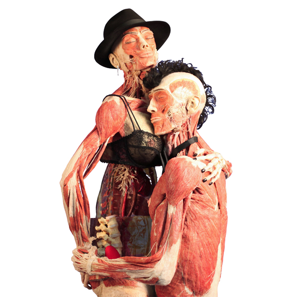 Possibly the most controversial display is found in a sectioned-off portion of the exhibition venue: it reveals a male plastinate sitting on a chair, straddled by his plasinated female lover, resembling a couple in the throes of passion. In close proximity to the display is a board which discusses the risks of sexually transmitted diseases and HIV/AIDS. The woman specimen has been dissected so that her torso (from below the breasts to the hips) has been removed and replaced with a torso-shaped glass casing. Her spine is visible, but the casing also shows in no uncertain terms that the specimens are posed in the sexual act.