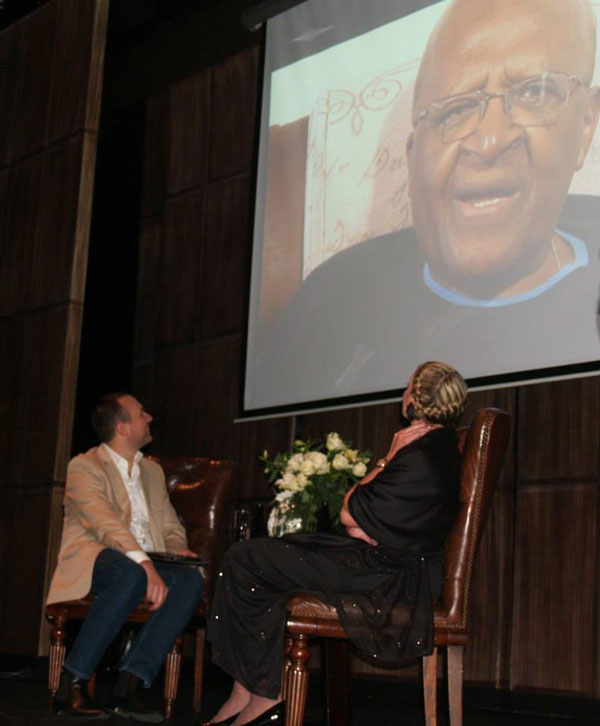 Emeritus-aartsbiskop Desmond Tutu praat per videoskakel vanaf die buiteland met onderhoudvoerder Adriaan Basson (Beeld se redakteur) en Zelda la Grange.