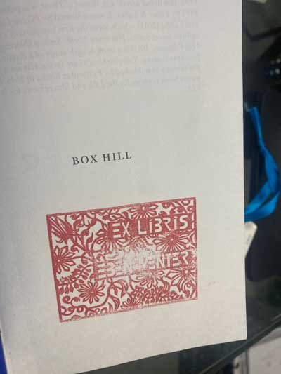 Eben vertel van sy boekery wat so te sê daarmee heen is. Benewens die hertoevoeging daartoe van Box Hill, gee ek vir hom as beskeie geskenk ’n kopie van Ruan Kemp se blink roman Wit leuen.