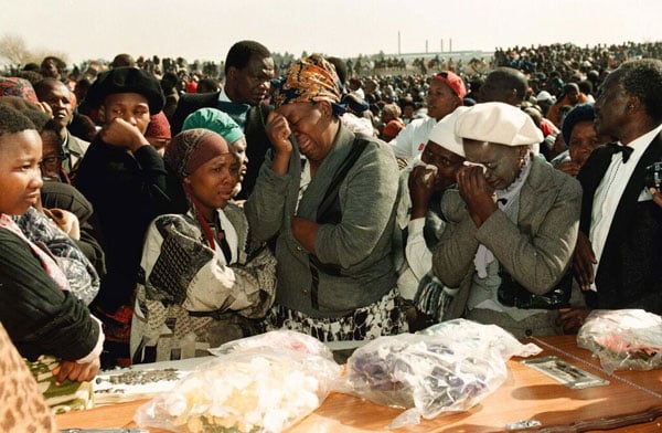 Vroulike roubeklaers huil langs ʼn kis tydens die begrafnis van mense wat omgekom het in die Boipatong-slagting.