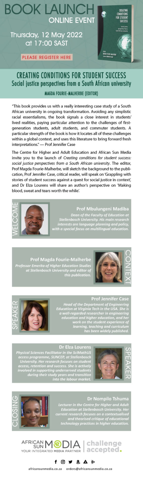 The Centre for Higher and Adult Education and African Sun Media invite you to the launch of Creating conditions for student success: Social justice perspectives from a South African university.