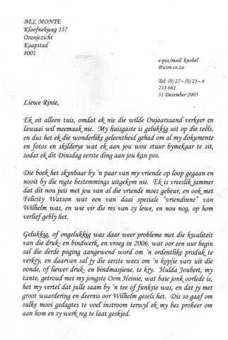 Maak jou maar gereed vir haar tipiese geen-twak‑ en “no nonsense”-benadering. Sy vat jou sommer reguit aan en vertel van haar eie ervarings met jou. Ek het niks aan die plakboek-insetsel verander nie, sodat jy sommer vir my kan laat weet of jy van my benadering hou. Jou vriende begin by A vir Aucamp tot by W vir Wiechers, en ek het oral probeer om ’n goeie foto van elke vriend te plaas, soos nou met Rinie. Sy het die foto’s aangestuur soos geneem kort ná hulle terugkeer na Suid-Afrika van Den Haag.