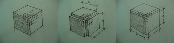 Beskou ’n kubus wat uit n3 kubusse bestaan, met ander woorde van grootte n by n by n. Om die kubus met een eenheid te vergroot – met ander woorde (n+1)*(n+1)*(n+1) – word ’n enkellaag kubusse op drie van die sye geplaas (aantal 3n2), ’n ry kubusse tussen elke twee sye (aantal 3n, - sien derde sketsie hieronder) plus een kubus in die hoek om die nuwe kubus te voltooi. In totaal het die kubus dan 3n2+3n+1 kubusse bygekry en die nuwe aantal is dus n3+3n2+3n+1 (wat dan ook die antwoord is van (n+1)3).