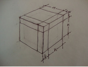 Beskou ’n eenheidskubus, grootte 1 by 1 by 1, maw n=1. Om hom te vergroot met ’n enkellaag (k=1) is die hoeveelheid 3.1.12+3.12.1+13 = 7,
