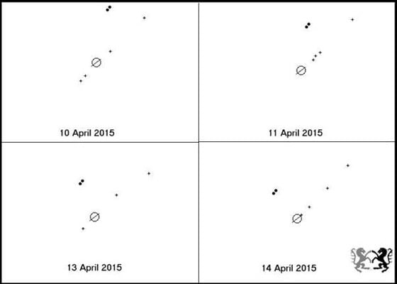 Die twee dowwe sterre, (tussen 13 en 14 magnitude en dus heelwat dowwer as die ‘ligstippels’) in die konstellasie van Cancer, het ek as bakens in my waarneming ingesluit, om aan te dui in watter rigting Jupiter en die ‘stippels’ teen die agtergrond van die sterre beweeg. Hulle is: USNO J0900343+175533 en USNO J0900353+175523.