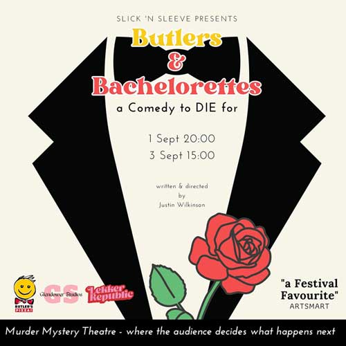 Butlers and bachelorettes is a murder mystery comedy where the audience has a part in the production. Audience members are asked at certain points in the play: what should happen next? Essentially, they vote for a particular choice and therefore help guide the story as it unfolds.
