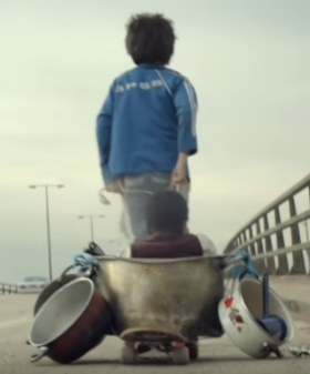 Zain mounts a pot on a stolen skateboard, loads Yonas in and pulls him across town to find the baby’s mom. The two end up sitting on a sidewalk eating shawarma.