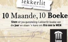 LAPA Uitgewers 2012-12-05 Tien maande en tien boeke later is dit tyd om vir jou gunsteling LAPA Lekkerlit-boek te stem. Jou stem kan jou R10 000 in die sak bring!