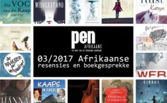 2017-04-06Hier is PEN Afrikaans se oorsig van Afrikaanse resensies wat in Maart 2017 verskyn het en digitaal beskikbaar is. Daar is ook skakels na boekbesprekings of -gesprekke en voorlesings wat op die radio of TV uitgesaai is.
