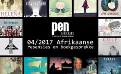2017-05-09Hier is PEN Afrikaans se oorsig van resensies van Afrikaanse boeke wat in April 2017 verskyn het en digitaal beskikbaar is. Daar is ook skakels na boekbesprekings of -gesprekke en voorlesings wat op die radio of TV uitgesaai is.