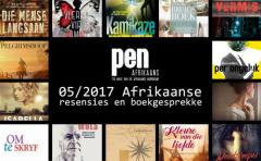 2017-06-06Hier is PEN Afrikaans se oorsig van resensies van Afrikaanse boeke wat in Mei 2017 verskyn het en digitaal beskikbaar is. Daar is ook skakels na boekbesprekings of -gesprekke en voorlesings wat op die radio of TV uitgesaai is.