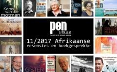 2017-12-07Hier is PEN Afrikaans se oorsig van Afrikaanse resensies wat in November 2017 verskyn het en digitaal beskikbaar is. Daar is ook skakels na boekbesprekings of -gesprekke en voorlesings wat op die radio of TV uitgesaai is.