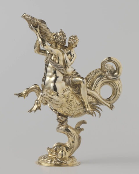 Figuur 7. Johannes Lencker, kan in die vorm van ’n triton en ’n nereïde, circa 1620, vergulde silwer, 34,5 cm × 25,5 cm × 12,5 cm, Rijksmuseum, Amsterdam (openbare besit, met vriendelike vergunning van die Rijksmuseum)
