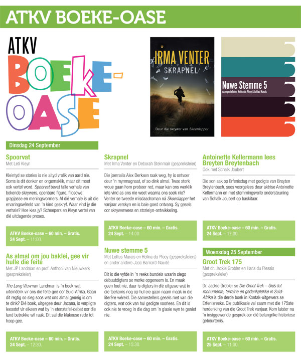 Die ATKV Boeke-oase by Clover Aardklop is daagliks oop van 09:00 tot 19:00 en alles wat daar aangebied word, is gratis. Naomi Bruwer het by Kabous Meiring uitgevind wat besoekers kan verwag.