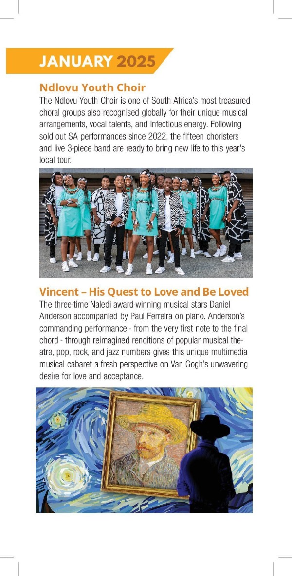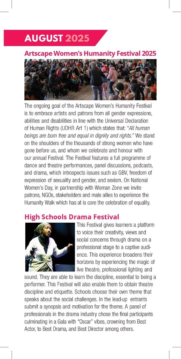 Please visit our website www.artscape.co.za for all our programmes for 2025. Be a change agent for the arts, for our children, for our youth, for our women and for yourself!
