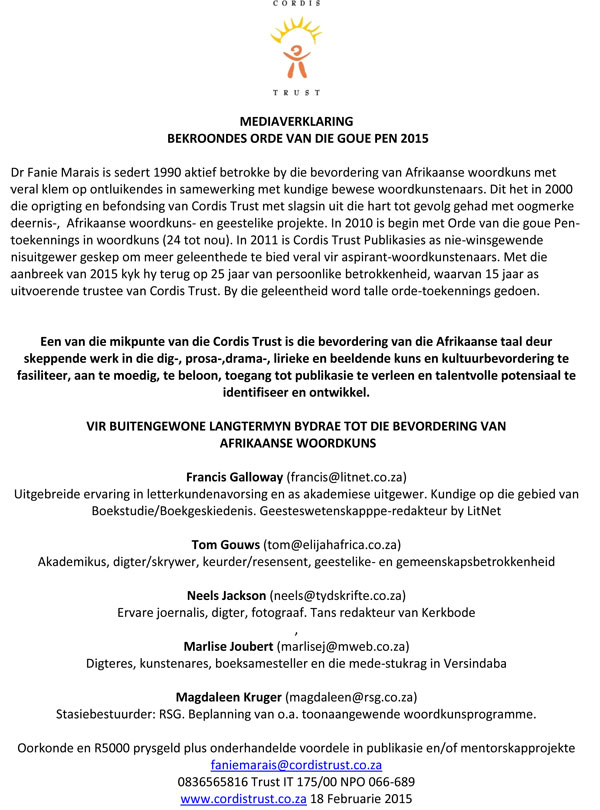 Klik hier om te sien wie die Orde van die Goue Pen 2015 bekroon is.