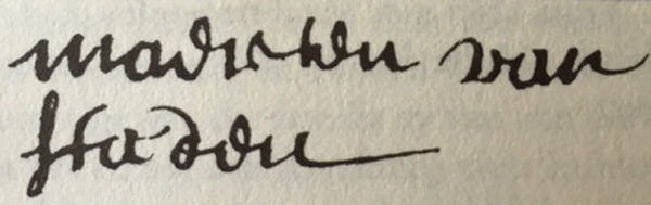 Maarten (Marten) zet volgens Pama deze handtekening in Zuid-Afrika. Hij is rond 1636 geboren in de omgeving van Haarlem/Bloemendaal/Overveen. Hij wordt hovenier en is mogelijk verwant aan de van Staden-familie die als “Hoveniers ten Hove” niet alleen in de 17de en vroege 18de eeuw de bewoners van de buitenplaatsen in de Vechtstreek bedient, maar ook de Oranjes in binnen- en buitenland.22 Hij trouwt twee keer. Zijn eerste huwelijk is met Margaretha (Maria) Ernstdr. van Amerongen in de vroege jaren 1670. In 1675 wordt hun zoon Martinus geboren; Maria overlijdt datzelfde jaar, waarschijnlijk in haar kraambed. Maarten hertrouwt in 1677 met Catharina Willems in Werkhoven, nog geen 5 kilometer van Neerlangbroek. Zij is afkomstig uit Giessen-Nieuwkerk - bij Gorcum - en is daar geboren rond 1647. Maarten is hovenier op verschillende plaatsen: rond zijn huwelijk in Werkhoven (1675-1680) en daarna in Doorn (1680-1685) bij het “huys te Doorn”. Dat is in die tijd in bezit van Caius Laurentius Barthram, zoon van de graaf van Broeckdorff. Het huis ligt om de hoek van de kerk van Doorn waar hij - zoals vermeld - diaken is. In 1685 besluit hij met zijn gezin te emigreren naar Zuid-Afrika. Zijn zesde kind Willem is dan net geboren en met alle kinderen komen Maarten en Catharina in 1686 aan in Kaap de Goede Hoop. Het gezin groeit in het nieuwe land aan tot de volgende 9 kinderen: Martinus (1675), enig kind uit eerste huwelijk, Maria (1678), Maurits Louis (1680), Johannes (1681) (Jan), Caspara (1683), Willem (1685), gedoopt 15 maart te Doorn met als getuige Aletta van Leersum - en in Zuid-Afrika: Elisabeth (1688), Elisabet (1690) en Petronella (1692).