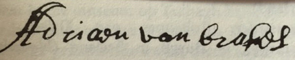 In het Groot Familieboek van Pama staat deze handtekening van vader Adriaan Willemsz. van Brakel. Hij is geboren in 1640 en afkomstig uit ’s-Hertogenbosch. In 1670 trouwt Adriaan in Zuid-Afrika met Sara van Rosendael (geboren circa 1650). Zij krijgen 14 kinderen, waarvan echter meer dan de helft voortijdig overlijdt. Naast Elisabeth (1674), Maria (1677) en Hermanus (1688) worden er onder andere drie Jacobussen gedoopt - respectievelijk in 1676, 1679 en 1681. Dit laatste jaar houden wij aan als het geboortejaar van “onze” Jacobus. Vader Adriaan is volgens Pama aanvankelijk veeboer, maar wordt later “suikerbierbrouer”. Hij is enkele malen ouderling van de Kaapse gemeente en “ ’n welgestelde man die onder meer ses skilderye besit het.” Zijn vrouw Sara overlijdt in 1690 en hijzelf in 1698. Zonen en dochters delen daarna in de welstand, want niet alleen Jacobus en Hermanus bezitten later landerijen maar ook zus Elisabeth blijkt een “rijke boerinne”. In 1703 trouwt zij als weduwe met Adam Tas, die volgens zijn tegenstanders met dit huwelijk “met de neus in de boter gevallen is”. Zij krijgen ook nog eens vier kinderen; op 40-jarige leeftijd (1714) ontvalt zij hem.