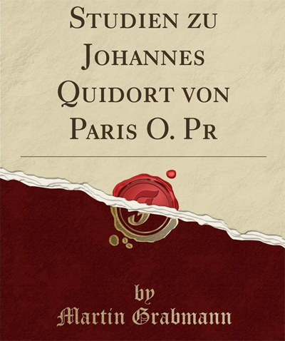 Figuur 1. Grabmann, M. 1922. Studien zu Johannes Quidort von Paris, O.Pr. München: Sitzungsberichte der Bayerischen Akademie der Wissenschaften. Die buiteblad van Grabmann se baanbrekende studie oor Quidort in 1922,op grond waarvan die moderne Quidort-navorsing bemoontlik is.