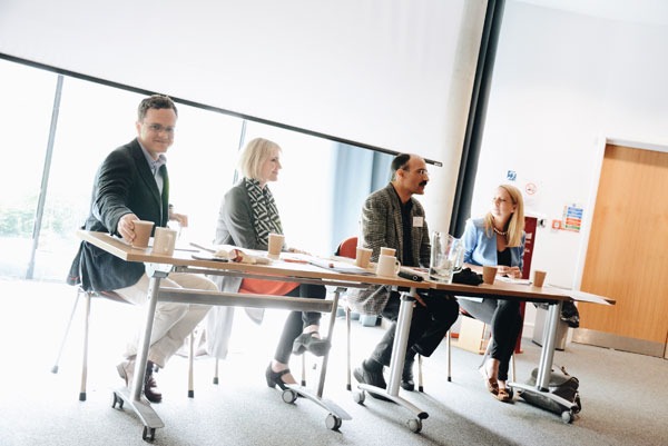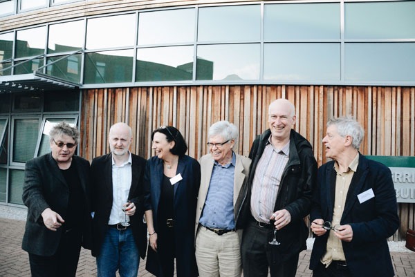 Writers at York: poets Paul Muldoon and Don Paterson, Judith Buchanan (York), Derek Attridge, poet John Wilkinson, and Hugh Haughton (York).
