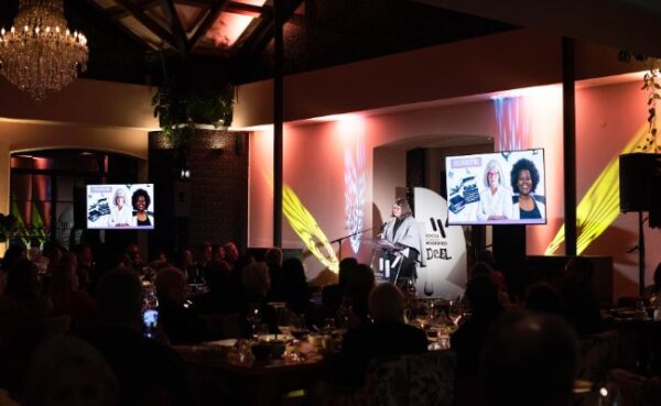 Fiona van Kerwel, seremoniemeester by die geleentheid, en die bestuurder van WOW (Woorde open wêrelde): “In die gees van vanjaar se Woordfees-tema, Deel, moedig WOW ook deelnemers aan om woorde, kennis en kreatiwiteit met mekaar te deel en so nuwe wêreld oop te maak.” (Foto: Naomi Meyer)