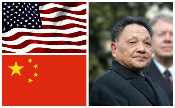 Foto van Xiaoping Deng: https://en.wikipedia.org/wiki/Deng_Xiaoping; vlae van China en die VSA: wikipedia