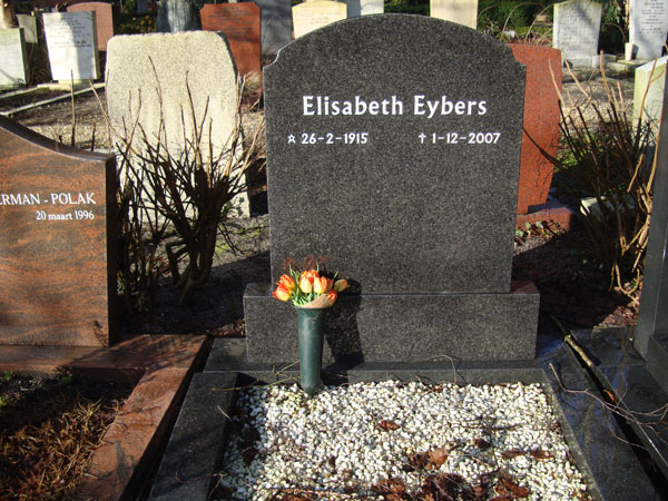 Hierdie foto het ek op Sondagoggend 22 Februarie geneem, enkele dae voor Elisabeth Eybers se 100ste geboortedagherdenking op 26 Februarie 2015. Elke jaar sedert sy op 1 Desember 2007 op 92-jarige leeftyd in Amsterdam oorlede is, fiets ek en Annemarie Balkema saam na die begraafplaas Zorgvlied ten suide van Amsterdam en laat ’n bos tulpe op haar graf agter. Party jare is dit guur en reën dit, soos die dag waarop sy begrawe is, maar soms is die lente in die lug, soos die afgelope Sondag, toe dit pragtige weer was. Elke jaar weer moet ek dink aan die nugter en ironiese manier waarop Elisabeth self oor begrafnisse en begraafplase geskryf het. Toe ek op haar begrafnis op 6 Desember 2007 moes praat, was haar eie woorde hieroor ’n groot troos. En steeds weer. Hierby ’n paar stukkies uit my huldeblyk van agt jaar gelede.