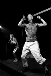 “The world is suffering from an information overload,” says the slightly more philosophical Ninja. The golden dolphin attached to his left earlobe dangles vigorously in mid-air. “How do you penetrate that? We’ve made something. Something that cuts through that like a laser,” as he straightens his arm, revealing more lyrical tattoos.