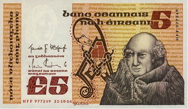 Figuur 2. Scotus, Bank van Ierland-£5-noot, in gebruik tot 1993, openbare domein