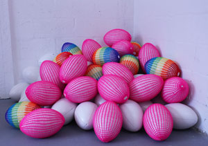 Die uitstalling bestaan meestal uit rugbyballe en akriel-garing. Daar is omtrent 150 balle en omtrent 18 km gare gebruik.
