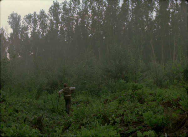 Later die aand, nadat Saul ’n pakkie buskruit van Ella (Juli Jakab) in “Kanada” kry, gewaar hy ’n nuwe groep Jode wat na die woud gelei word. Saul val doelbewus saam met hulle in die ry met die hoop om ’n rabbi tussen hulle te vind. Aangesien die gehoor tot Saul se oogpunt beperk word, word die gehoor ook tot sy subjektiewe “hoor”-punt beperk, omdat die klankbaan tydens ’n nabyskoot van ’n karakter deur gehore identifiseer word as dít wat die karakter hoor (Chion 2003:90). Deurdat die meeste van die gebeure buiteskerm geplaas word, dien die klankbaan as verwysingsraamwerk van wat rondom Saul plaasvind. Wanneer geluide op die klankbaan speel sonder dat die oorsprong daarvan voorgestel word, verwys Chion (2003:71) na hierdie klanke as akoesmatiese klanke, en indien die bron nie gou bekendgestel word nie, word hierdie “klanke en gebeurtenisse met misterie belaai” (Chion 2003:72). Terwyl Saul saam met die gevangenes loop en ’n rabbi soek, vul ’n onheilspellende geluid wat moeilik is om te identifiseer die klankbaan – soos massas water wat op ’n warm plaat val. Namate Saul verder loop, kom daar al hoe meer buiteskermgeluide op die klankbaan: ’n kind wat huil; ’n Babelse verwarring van tale; bevele wat geskree word; angswekkende hulpkrete; knetterende vlamme; koeëlreën. In plaas daarvan om dit te aanskou, en net soos in die openingstoneel waar hulle vergas word, word die gehoor gedwing om na die teregstelling van die Jode te luister.