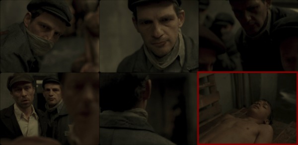 Dit is vir ons as gehoor net so moeilik soos vir die geskiedkundiges en psigoanaliste (in Felman en Laub se voorbeeld), om te begryp wat weerstand in die konteks van Auschwitz “behels”. In Son of Saul bied die Sonderkommando-lede weerstand deur middel van geweld; Saul bied egter weerstand deur die seun ’n waardige Joodse begrafnis te wil gee.16 Hoe verstaan ons Saul se begeerte om ’n rabbi te vind en die seun ’n begrafnis te gee, iets wat op sig sinloos, onmoontlik en onnosel voorkom? Saul is ’n Sonderkommando-lid wat daagliks walglike take moet uitvoer: Hy moet sy mede-Jode na die dood toe lei en alle bewysstukke van hulle bestaan vernietig. Indien Saul versuim om sy pligte deeglik uit te voer, sal hy vermoor word. Dít is die dodelike en neerdrukkende omgewing van Saul se ervaringsleer. Saul probeer egter steeds die “irrasionele” en “onmoontlike”: om die seun ’n waardige Joodse begrafnis te gee.