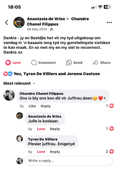 Tyrone de Villiers, “Juffrou” Anastasia de Vries en Chundre Filippus, of “Eeltjie”, soos Anastasia haar genoem het. Chundre is Tyrone se girlfriend, hulle het saam gestudeer by UWK. Anastasia het Tyrone soms “Beeldjie” genoem, of “Meester”.