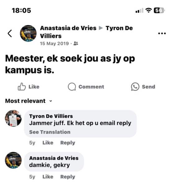 Jy’t my voorgestel aan Kaaps. Die eerste gesprek wat ek bygewoon het, was ’n onderhoud wat jy gelei het en in die onderhoud het jy gebrag van ons, van my. Dit was ’n eer. Alles waarby ek nou betrokke is en van hou, het jy vir my moontlik gemaak. God het jou op my pad gesit. Wat God gee, kan niemand wegvat, nie eens Hy nie. By my sal jy bly. Jy het my ’n liefde vir taal gegee. Al die jare het ek my voorberei, maar ek het nooit besef dis iets wat ek kan doen nie. Dit het soos tweede natuur vir my gevoel om Engels en Afrikaans te slaag sonder om te study of om essays te skryf en pryse daarvoor te wen of om elke dag deur ’n woordeboek te lees as kind net om nuwe woorde te leer. Jy het my laat besef dis iets wat ek kan gebruik om die samelewing te verander. Wie sou kon dink dat ek dit al die jare misgekyk het? Die einste wapen waarmee God die wêreld geskape het. Jou woorde het die woorde binne in my ontsluit en I will pay that forward. Ek sal my nerwe afwerk om seker te maak dat ons kinders die confidence van ’n witkind sal hê. Hulle sal vi’ niks terugstaan of onvrymoedig voel nie. Veral nie vir die manier hoe hulle praat of klink nie.