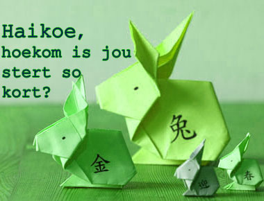 Sowat twee weke gelede het ons ’n haikoe-kompetisie van stapel gestuur, en my wêreld! Ek kan nie glo hoeveel mense belangstel in haikoe nie. Die inskrywings stroom in, oor alle denkbare temas, van die meer voorspelbare bome en mane en trane tot heel aweregse versies oor winde en ’n verskeidenheid intieme plesiertjies. Maar wat dié maal opvallend is oor die inskrywings, is dat hulle stukke beter is as die inskrywings wat inkom wanneer ons nie ’n digvorm voorskryf nie. Die insigte is skerper, daar is minder cliché en baie minder stroop en die skrywers is minder geneig om amateur-sondes te pleeg wat gewoonlik volop is in kompetisie-inskrywings.