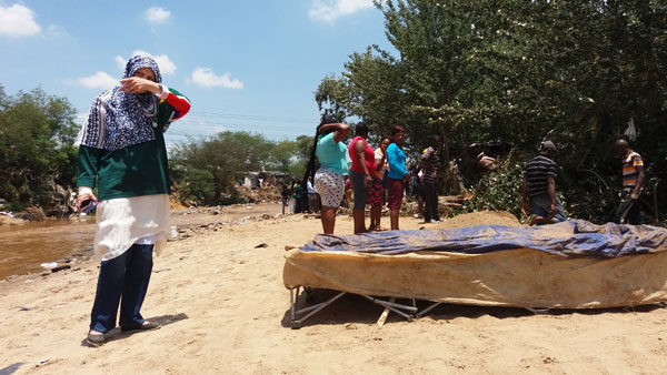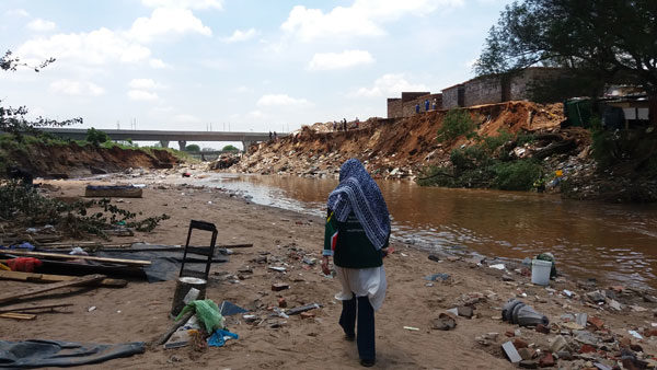 Ek stap weer af oewer toe, na die Stjwetla informele nedersetting. Oral staan mense steeds rond. Die brug oor die Jukskei dien nou as wasgoedlyn vir die volk se nat matte en komberse en klere. Wat veral opval, is die derduisende ton bouafval en rommel wat op die oewer gestort lê. Jy moet omtrent mooi trap om jou weg te vind tussen stukke teëls en boublokke en elke denkbare stuk gemors wat afval genoem kan word. So probeer hulle van die rivier steel, hoor ek ’n omstander sê. Die grond word so gelykgemaak en dan kan hier gewoon word. Dis maar hoe dit hier gedoen word, sê hy.