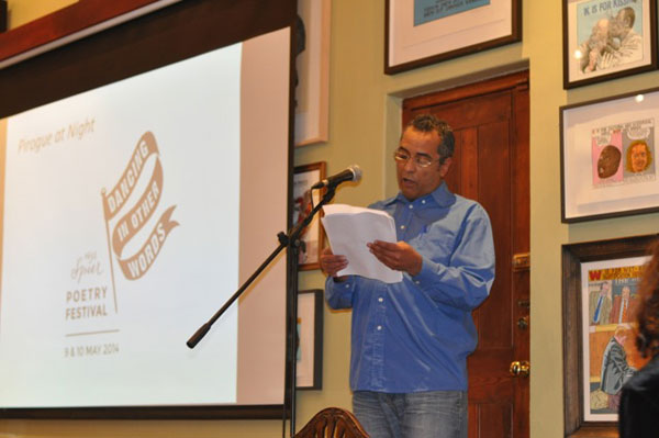 Georges Lory (links) en Breyten Breytenbach (op die voorgrond) het om die beurt Abdellatif Laâbi se gedigte in onderskeidelik Frans en Engels voorgedra. Laâbi kon weens gesondheidsredes nie die fees bywoon nie.