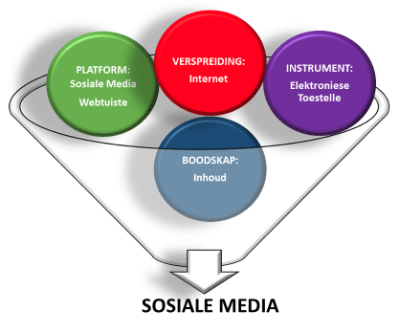 Hoewel sosiale media reeds meer as twee dekades lank deel van ons lewe is, is daar steeds geen algemeen aanvaarde definisie vir die begrip nie. Volgens Boyd (2009:1) is sosiale media die sagteware wat gebruikers in staat stel om te kommunikeer, inligting te deel en saam te werk. Nations (2021) en Cohn (2011:1) beskryf sosiale media as platforms wat aanlyn tegnologie vir interaktiewe dialoog gebruik. Ander beskryf sosiale media kortliks as media wat gebruik word om sosiaal te verkeer (Safko 2012:3). Na aanleiding van die verskillende definisies beskryf Stegen (2019:193) sosiale media as: “The set of web-based broadcast technologies that enables people to communicate and to develop from consumers of content to creators of content.”