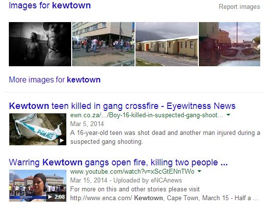 Google gerus Kewtown. Bendegeweld en tik is groot probleme in hierdie omgewing.