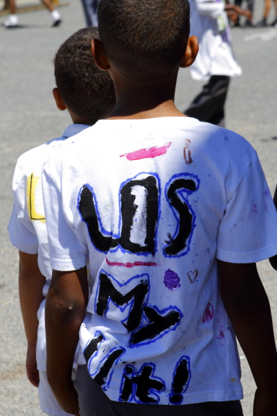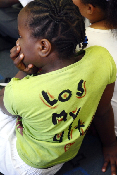 As deel van ’n geïntegreerde kunsklas het die leerders toe vir hulleself “spesiale hemde” gemaak met “Los my uit!” wat daarop geverf is.