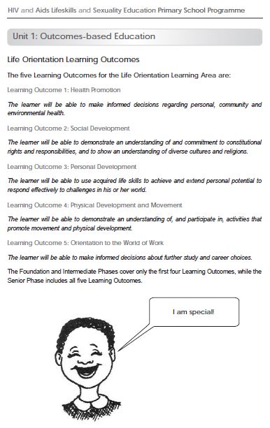 Verder is die subteks van hierdie dokument, soos geskets in ’n prentjie onder die opsomming van Lewensoriëntering se uitkomstes, duidelik: “I am special” (bladsy 16).