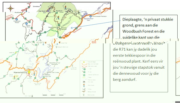 Ons roete begin in ’n majestueuse kloofveld met aangeplante dennewoude en wildepiesang, tipies van ’n wolkbergreënwoud. Vir ’n kilometer of so stoei ons deur bosvarkpaadjies en hou so ver moontlik langs die waterval wat na benede tuimel. Elke uur neem ons ’n blaaskans onder een van die indrukwekkende silwerblare en rol die kaart oop om met ’n merkerpen ’n wilde stippellyn op die ruwe terrein aan te bring.
