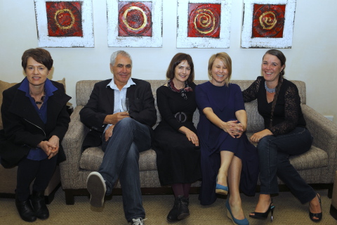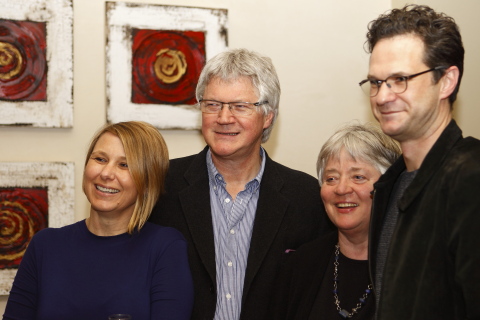 Hier is nog lede van hierdie jaar se Ingrid Jonker-span. Van links na regs is Beverly Rycroft (beoordelaar en 2012-wenner vir Missing), Leon de Kock, Finuala Dowling, Karin Schimke (die wenner) en Liesl Jobson (beoordelaar). Die derde beoordelaar, Geoffrey Haresnape, het ’n ander afspraak gehad en kon nie die geleentheid bywoon nie.