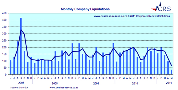 Statistieke wat deur Corporate Renewal Solutions gehou word, toon ‘n skerp afname in die getal likwidasies (vrywillige likwidasies uitgesluit) sedert die inwerkingtreding van besigheidsredding (sien aangehegte grafiek wat vir sigself spreek). Die afname van 72% in likwidasies in 2011 word gedeeltelik toegeskryf aan besigheidsreddingprosedures.