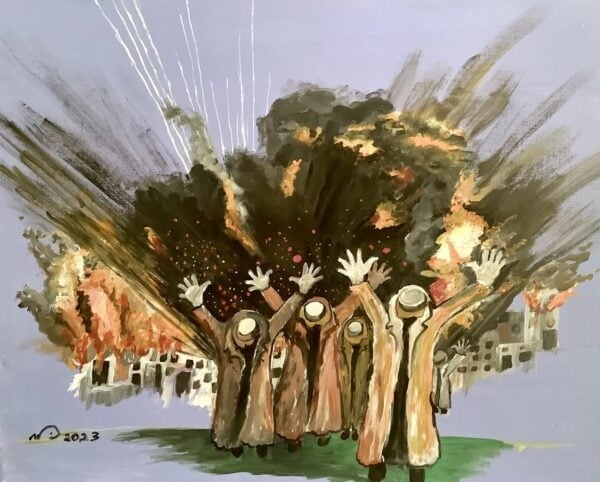 lgende onderskrif: "Hierdie skildery is onlangs deur die oud-Suid-Afrikaanse Kanadese kunstenaar, Ninette Murphy, gemaak. Dit is geïnspireer deur wat gebeur met slagoffers in die oorlog tussen Rusland en Oekraïne, asook in die konflik tussen Hamas en Israel.