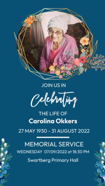 Haar godvresende lewe was ’n voorbeeld vir ander, deurentyd bewus van wat in Psalm 90 vers 10 geskrywe staan: “Die dae van ons jare – daarin is sewentig jaar, of as ons baie sterk is, tagtig jaar [...]” En hier was sy, Caroline Okkers, wat deur genade tot anderkant 90 uitgehou het, vasgebyt en staande gebly het, hoewel in haar laaste jare met ’n kierie in die hand, sukkel-sukkel buitentoe om ’n bietjie son op die stoepie by die voordeur te geniet, die kleur van die graan- en kanolalande te sien verander – ploegvaal, groeigroen, oesgoud – hier oorkant haar huis in Dennestraat en doer anderkant die teerpad wat na die Hemel-en-Aarde-vallei lei.