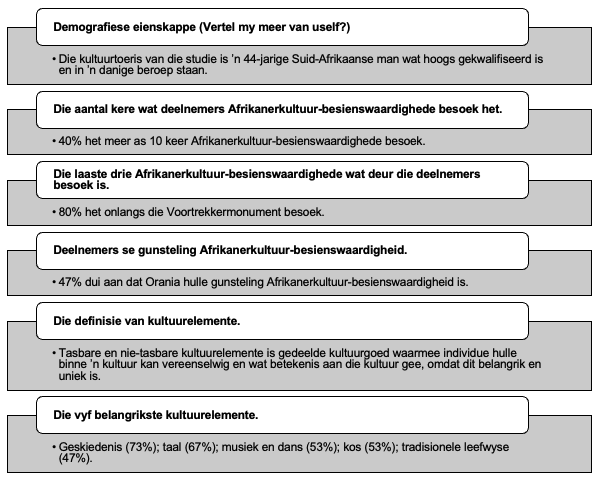 1 Die belangrikste kultuurelemente (geskiedenis, taal, musiek en dans, kos en tradisionele leefwyse) is gevind in die artikel “Die belangrikste kultuurelemente van Afrikanerbesienswaardighede” (Myburgh, Du Plessis en Van der Vyver 2023). Hierdie artikel bou voort op die artikel deur uit te wys hoe hierdie elemente kreatief aangebied kan word.