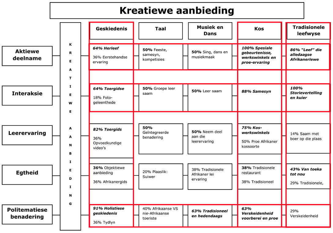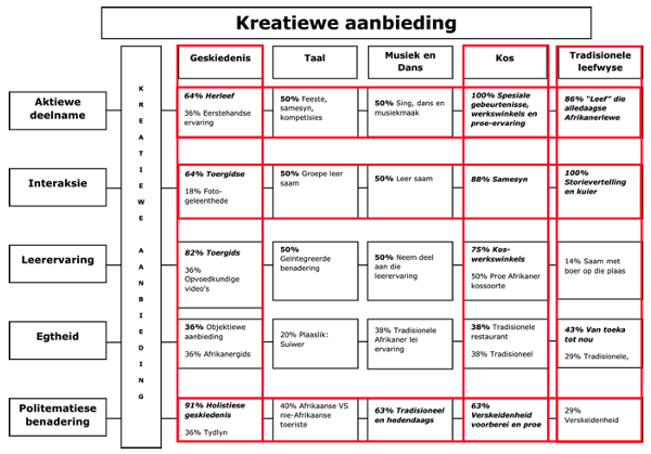 | Aktiewe deelname | • Kreatiewe ervarings moet gediversifiseer word en verskeie aktiwiteite aanbied. • Toeriste moet aktief by die aktiwiteite betrek word. |