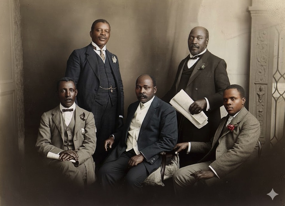 Hierdie foto toon die South African Native National Congress se afvaardiging na Engeland, Junie 1914. Van links: Thomas Mapike, eerwaarde Walter Rubusana, eerwaarde John Dube, Saul Msane, Sol Plaatje. Die afvaardiging het probeer om die Britse regering sover te kry om in te tree teen die Natives’ Land Act van 1913, maar die uitbreek van die Eerste Wêreldoorlog het hulle poging gefnuik.